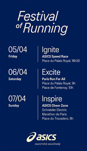 Asics is gearing up to host a one-of-a-kind Festival of Running weekend in Paris from April 5 to 7, 2024, dedicated to showcasing the transformative power of running on the mind and body.