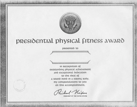 Generations of American schoolchildren would every year perform a series of exercises, either at top speed or with as many repetitions as possible, before the “phys-ed” teacher called a halt. The children would be scored against standards, and at the end of the year, if they scored high enough, they would receive a certificate – the Presidential Fitness Award – with the facsimile signature of Ronald Reagan, or whoever was in office at the time, as well as a patch.