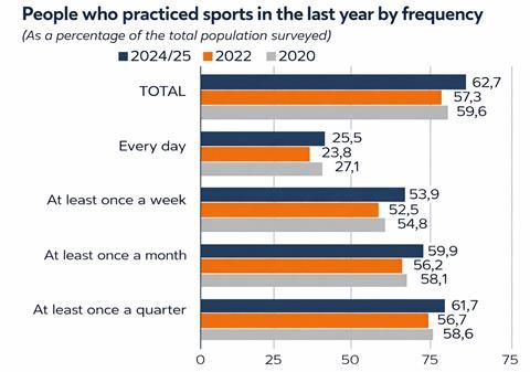In 2024/25, 42.5 percent of sports participants engaged with a professional coach or as part of a team, which is a 7.4 percent increase from the 2022 figure of 35.1 percent.