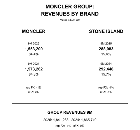 Moncler Group closed the first nine months of 2025 with consolidated revenues of €1.84 billion – flat when adjusted for currency fluctuations. The flagship Moncler brand delivered the lion’s share of group revenues, at €1.55 billion, while Stone Island contributed €288 million, edging down 1 percent year-on-year. The third quarter alone brought in €615.6 million, a marginal 1 percent decline that reflected the broader challenges facing luxury retail – from cautious consumer sentiment in Europe to wholesale channel headwinds.