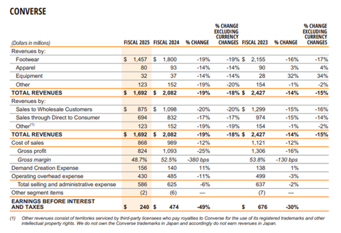 Converse’s revenues for fiscal 2025 (ended May 31) amounted to 3.65 percent of the total for Nike Inc. The annual report tells of a halving of Converse EBIT (down 49%, from $474m to $240m).