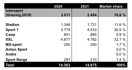 While Gresvig and its three brands (G-Sport/G-Max, Intersport and Sportshuset) saw their sports retail market share decline for the third consecutive year to 16.8 percent on total sales of NOK 2,494 million ( €245.5 million) compared to NOK 3,011 million in 2020, three other retailers saw year-over-year gains.