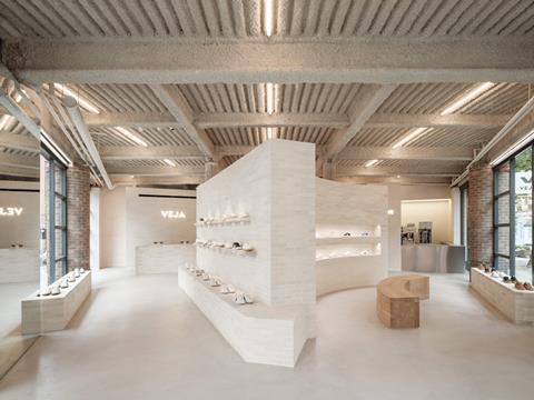 French sustainable sneaker brand Veja has inaugurated its first store in London’s bustling Seven Dials district. Nestled at 45 Monmouth Street, bridging the gap between Covent Garden and Soho, the 140-square-meter boutique showcases the brand’s footwear collection, complemented by an onsite cobbler station for sneaker and shoe repairs and cleaning services, catering to all brands. Veja collaborated with London-based interior designer Deidra Hodgson to bring its store concept to life. The space boasts a distinctive rounded shelving display crafted from 5,000 natural stone bricks sourced from France. Opting for natural stone bricks over conventional clay ones, Veja underscores its commitment to sustainability. These bricks are manufactured without firing, significantly reducing their carbon footprint.