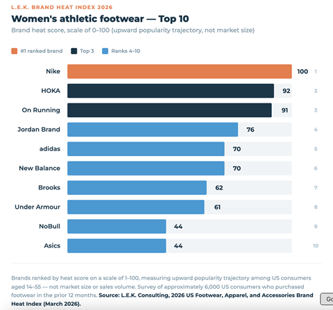 Published March 3, 2026, L.E.K. Consulting’s fifth annual Brand Heat Index surveyed approximately 6,000 US consumers aged 14 to 55 who had purchased footwear, apparel or accessories within the previous 12 months. Around 650 brands were scored on a standardized 0–100 index measuring upward popularity trajectory – not size – across athletic, casual, outdoor and dress categories in footwear and apparel, plus bags & luggage and outdoor equipment & sporting goods (the latter two appearing in the index for the first time this year).